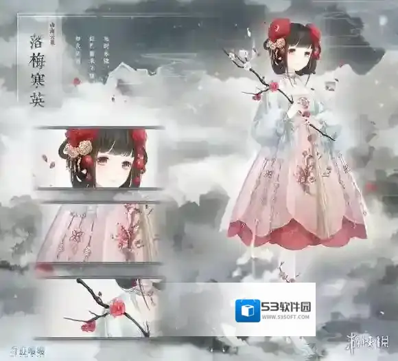 落梅寒英含正常姿势与特殊姿势,海报展示妆容为“今夕月”,可通过设计图制作获得。