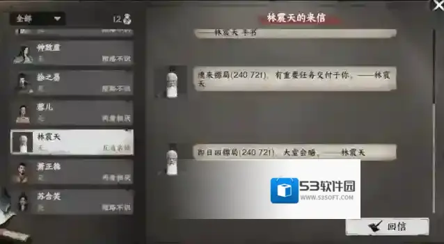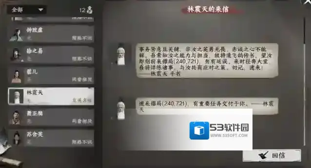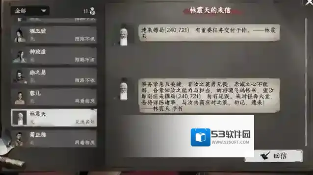 做悬赏任务将门派好感提升到25时收到林震天飞鸽