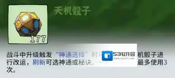 在遇到我们不想要的神通或者通用技能时,我们还可以选择投掷一次天机骰子进行更换。天机骰子属于消耗品道具,每次升级选择技能时都能够投掷且仅能够投掷一次, 可别小巧这一次重新选择的机会,它能帮我们的体系更容易成型。