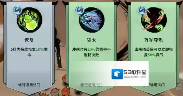 除了神通技能之外,每一场战斗还会出现通用技能,通用技能会为我们提供额外辅助的能力与恢复功能等作用,有的技能效果还能堆叠。通用技能也是升级后才会出现,它会与神通技能交替穿插着出现,同样是3选1,与神通技能不同的是,局内技能更需要针对当前局势的状况进行选择,且存在一定的随机性,所以它不是固定化思路。
