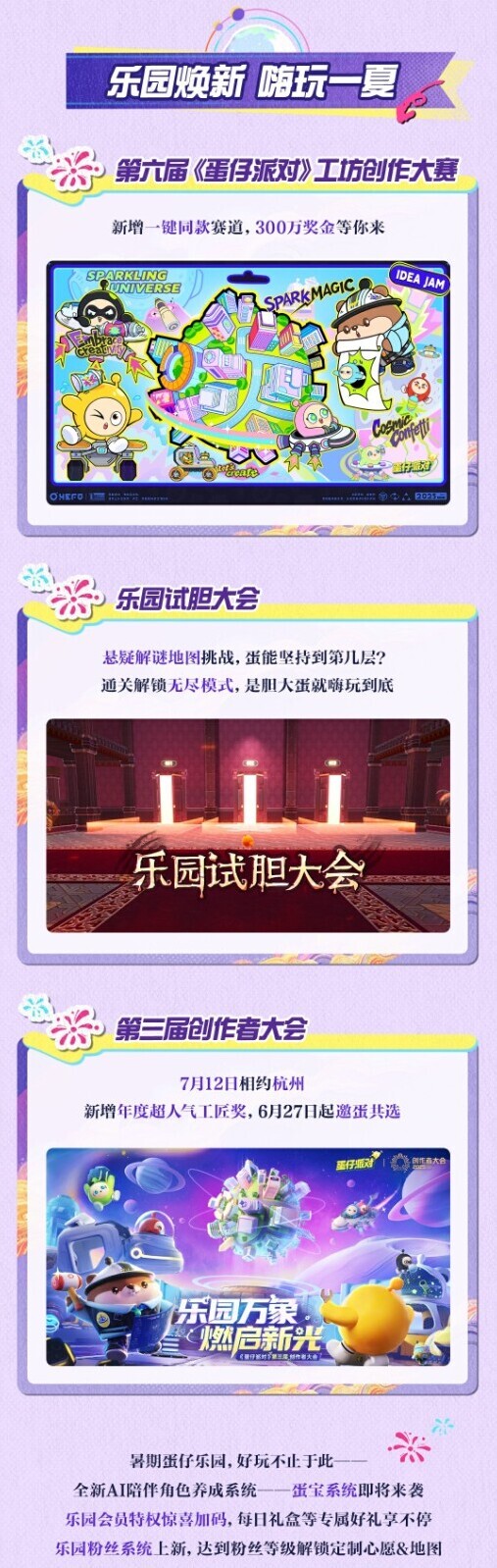 三周年乐园大焕新,第六届工坊创作大赛、乐园试胆大会、第三届创作者大会都将接连拉开帷幕,属于乐园蛋和工匠蛋的夏天,来了!