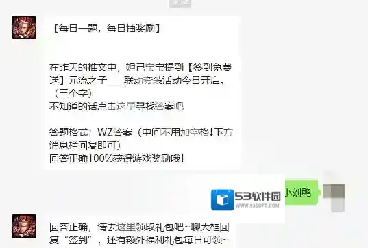 问题:在昨天的推文中,妲己宝宝提到签到免费送元流之子____联动套装活动今日开启(三个字)。