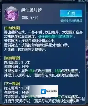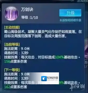 简评:蜀山技能CD较长,在前期可升级御剑术补充伤害,中后期技能点数较为紧俏,不建议升级普攻技能。