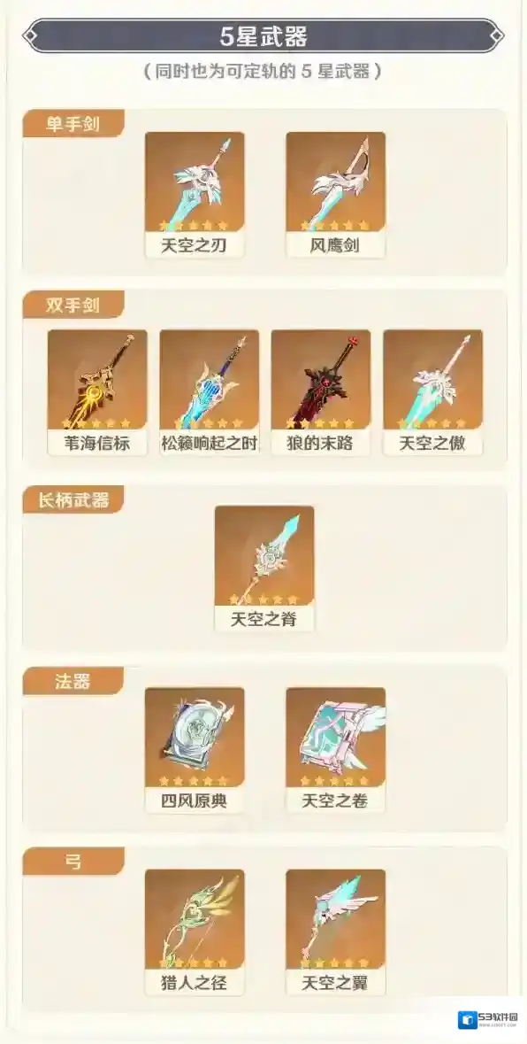 五星武器有天空之刃、风鹰剑、苇海信标、松籁响起之时、狼的末路、天空之傲、天空之脊、四风原典、天空之卷、猎人之径以及天空之翼。