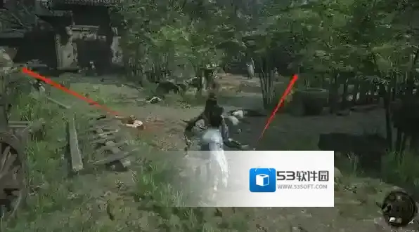 回到含光禅院的入口位置,沿左侧箭头处会看到两个房屋,分别可以拾取新生的赤汞*1和顽猴玉佩*1。不过要小心,这里的玉佩上方有两个敌人“老六”在巡逻。右侧箭头处,桌上可以找到青霜·单手剑*1,而屋内击败僧人后则可以获得蒸面兔*3。