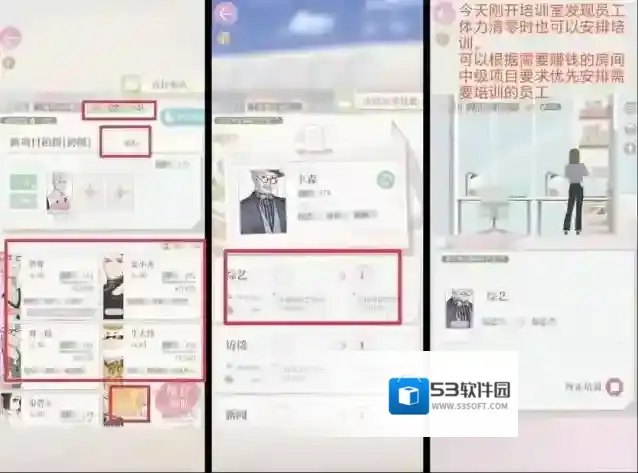 右侧选择不同的房间安排工作。前期任务点数要求很低,只放一个员工即可。在声誉4级前需要4小时手动给员工换班。