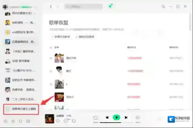 3.在恢复歌单界面,可以看到被删除的歌单,以及在歌单内被删除的歌曲,左侧是这些内容被删除的时间;