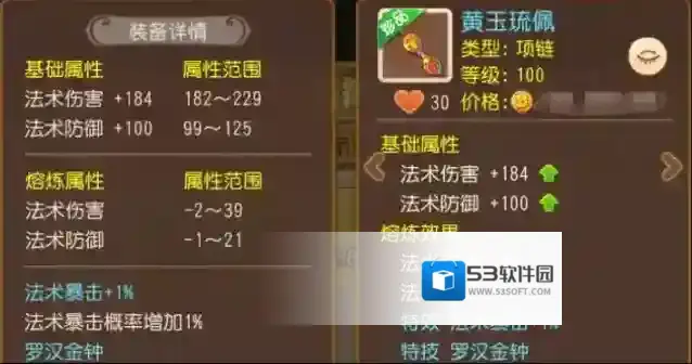 神威少侠会相对追求特效的加成,这条黄玉琉佩初始法术伤害184点,初始法术防御100点,带有特效法术暴击+1%及特技罗汉金钟,妥妥的毕业装!
