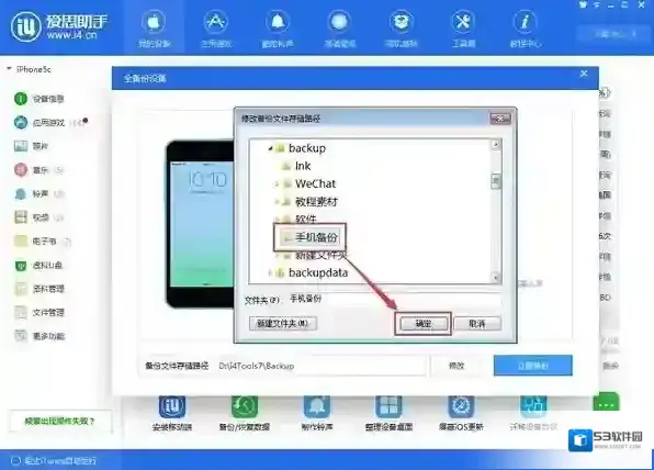 在修改备份文件存储路径窗口中,用鼠标点击选中想要用来保存手机备份文件的文件夹,然后点击确定,就可以将文件夹修改为手机数据备份文件夹;