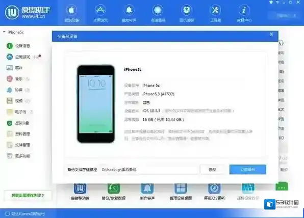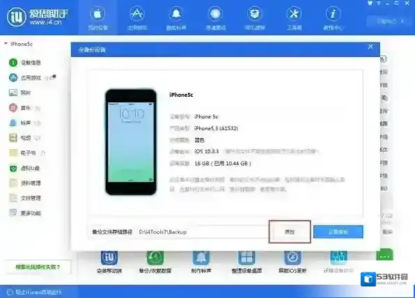这时候爱思助手全备份设备窗口会自动弹出。我们可以在这里确认备份的信息。爱思助手有提供默认的备份路径,我们也可以对备份路径进行修改,点击备份路径右边的修改;