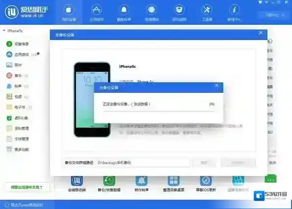 爱思助手正在备份手机数据。全备份设备耗时比较长,请耐心等待备份完成;