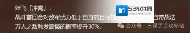张飞的藏书阁韬略可以开局上畏惧,并且触发震慑概率提升到了30%,本来应该是很强力的。