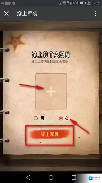 五、然后点击框框上传自己的照片,并选择性别,点击“穿上军装“就可以啦~