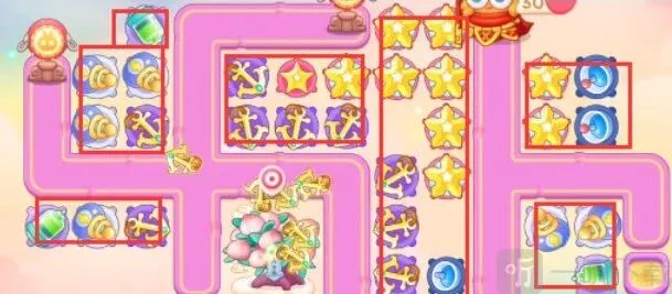 1、本关能够使用的炮塔是:毒针、船锚、闪电炮、雷达、烟花、星星,这一关我们用船锚和星星打输出。