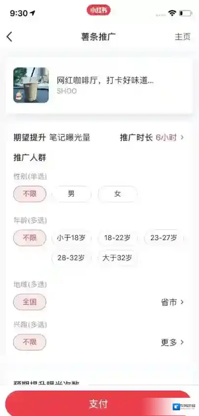 2、选择系统智能推荐,系统会将笔记智能推荐给对 笔记内容感兴趣的用户;也可以根据自己的推广需求来自定义选择投放特征。