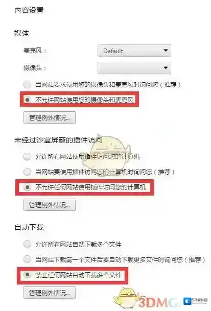 6、继续往下拉,看到“媒体”“未经过沙盒屏蔽的插件访问”“自动下载”都勾选不允许任何网站自动下载多个文件。