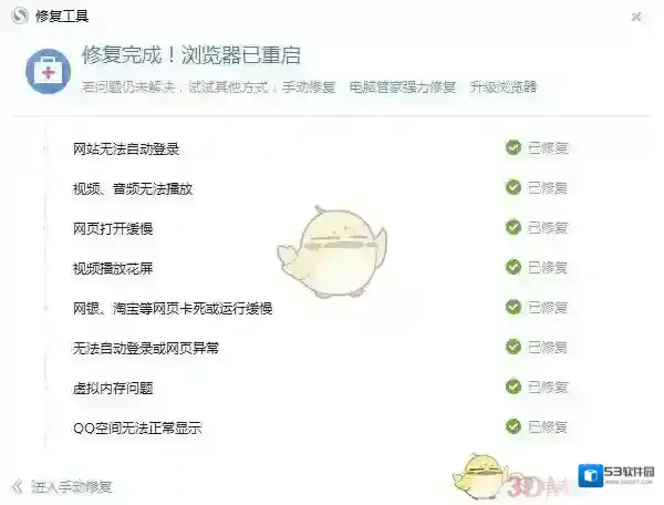 弹出浏览器修复窗口,如下图界面默认为快速修复,可修复界面例出的问题,点击左下角为手动修复,可以修复其他的问题,右下角有电脑管家强力修复,点击则提示安装电脑管家,可安装进行修复,按照自己的需要决定。