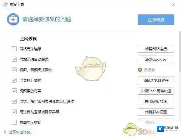 快速修复可修复网站无法登陆、音视频无法播放、网页打开缓慢、虚拟内存等问题,如果可以在快速修复界面找到你遇到的问题,则点击快速修复,