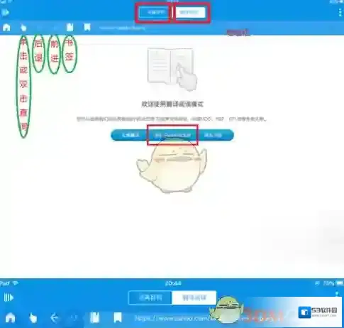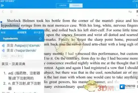 1.欧路词典的阅读模块支持网页、电子书(.EPUB, .DOC, .PDF ),并且与查词模块无缝对接。这几种格式有大量很好的阅读资源。过去在IOS(苹果)手机和IPad里用欧路词典跨软件查词很方便,IOS9禁止了内部复制,查词变得比较麻烦。在欧路词典的阅读模块你读书遇到生词,只要手指一点,解释界面就会弹出词义,非常方便