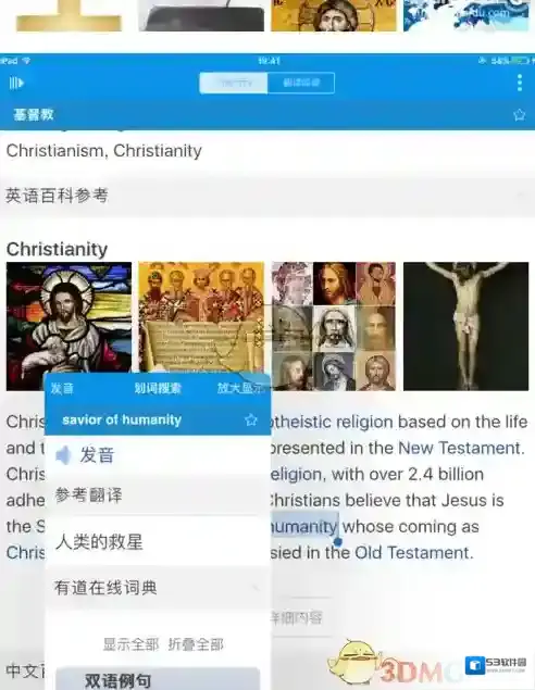 2.新版的欧路查词模块词典链入了英文版的维基百科,这是个非常好的资源,在查词界面就可以阅读。在这个界面,如果要查的词不在中,只要点击一次,就会弹出它的词义。如果单词在中,一点击就会翻到新的页面,需要点击查词输入框中的词才能返回。查询中单词的办法是,长按旁边没有的单词,滑动到要查的词上面手指离开,这时候只要点击弹出菜单上的“搜索”按钮就会弹出解释界面。