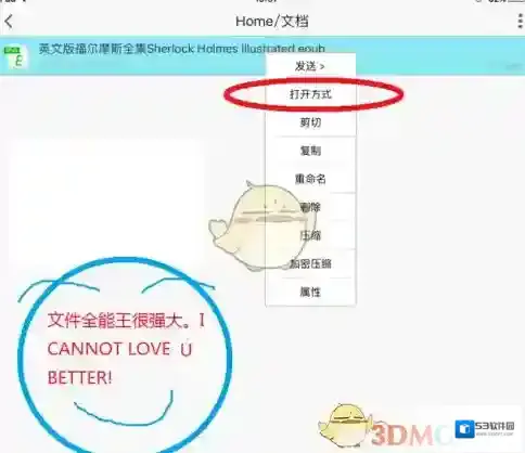 5.在欧路词典的阅读模块还可以阅读电子书。阅读之前要先把电子书上传到欧路词典里面。上传电子书有两种办法。一种是用欧路自己的WIFI传输模块上传,另一种是用第三方软件,例如功能强大的免费软件“文件全能王”来导入。先把电子书文件上传到文件全能王的文件夹,长按该文件,选择“打开方式”,再选择“拷贝至欧路词典”,然后就可以在欧路里面打开阅读了。