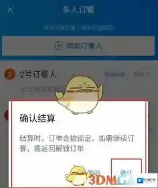 7、选择完成后,点击去结算,这时系统会弹出一个页面让你确定是否结算,并提示,结算时,订单会锁定,如需继续订餐,需要返回解锁,点击确定就可以了。