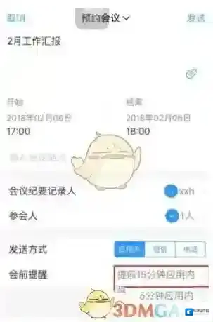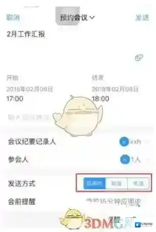 6.选择发送方式后,需设置会前提醒,默认是“提醒15分钟…”,可以手动点击设置。