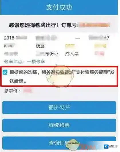 打开“铁路12306”APP,支付完成后,按照页面上的引导,选择支付宝接收通知功能。