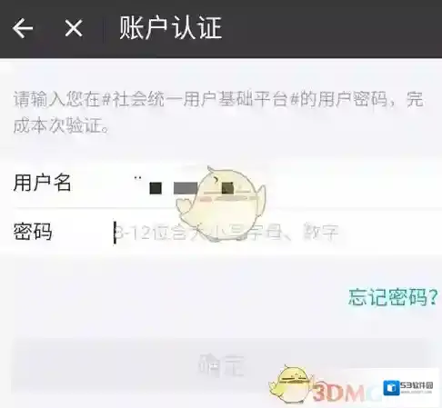 4、按界面提示输入“社会统一用户基础平台”的用户名和密码”(没有注册的先行注册,这个号其实就是登录社保个人服务网页的用户名和密码),点击“确定。