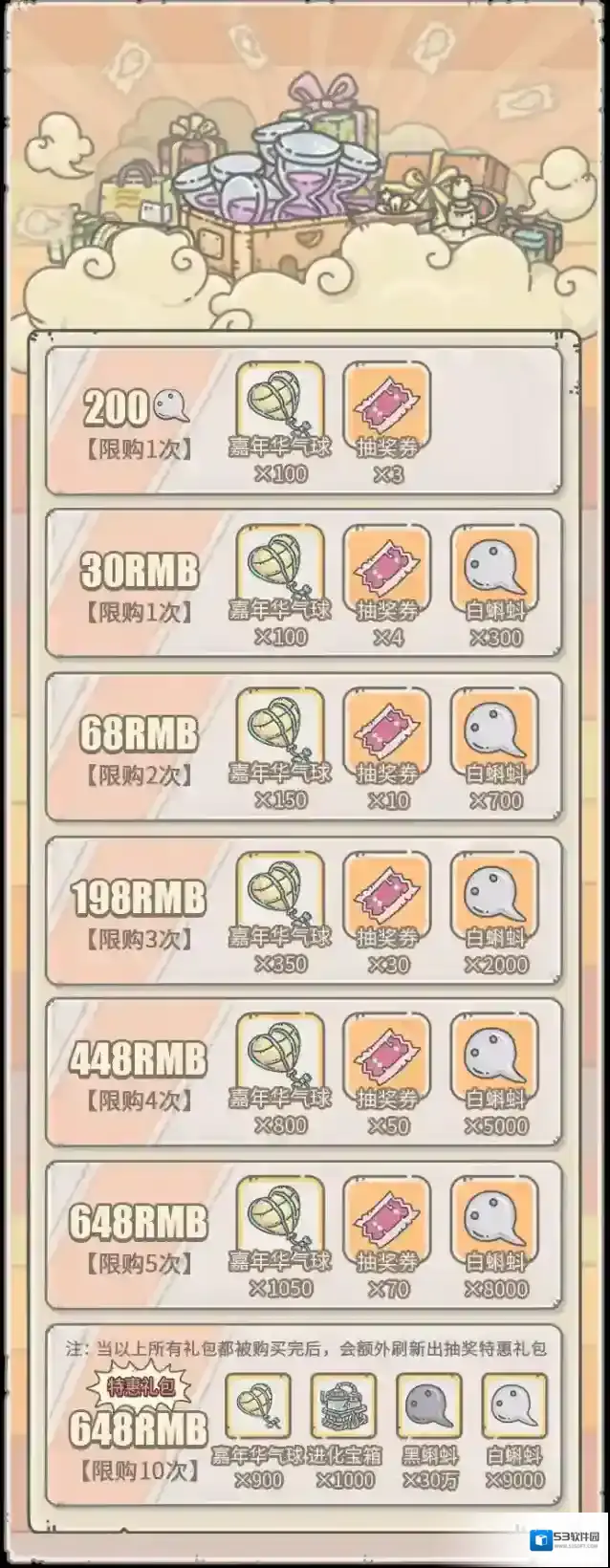 活动期间,每天会在贩售机中出现福利礼包,每天5点刷新,售价1白蝌蚪。内容为:白蝌蚪×20、抽奖券×3、嘉年华气球×100
