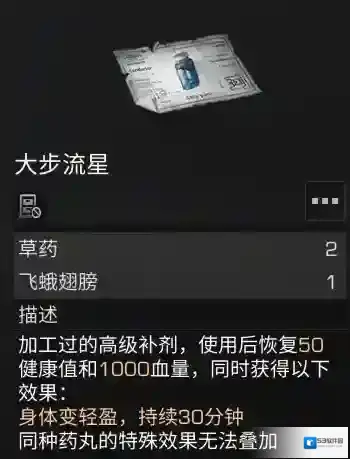 效果:恢复健康值50;恢复血量1000;身体变轻盈,持续30分钟