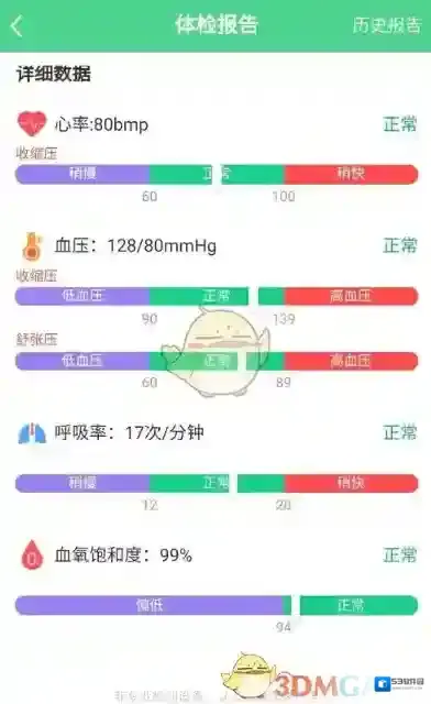5、打开体检报告界面后向下滑动,然后就可以看到血压、心率、呼吸率和血氧饱和度数据了。