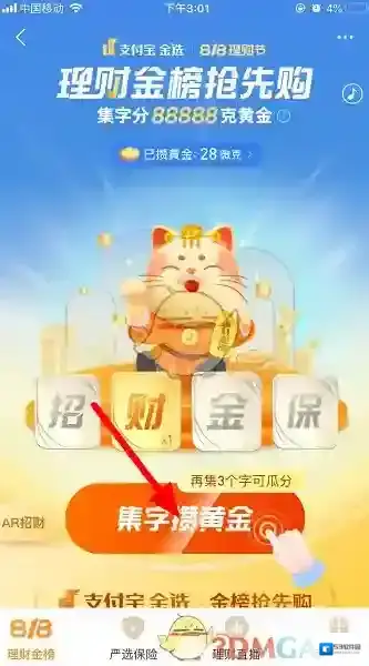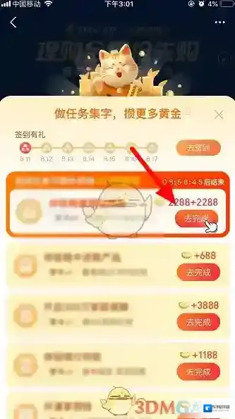 5、做任务集字,点击“去完成”,完成任务就可以攒到更多黄金。