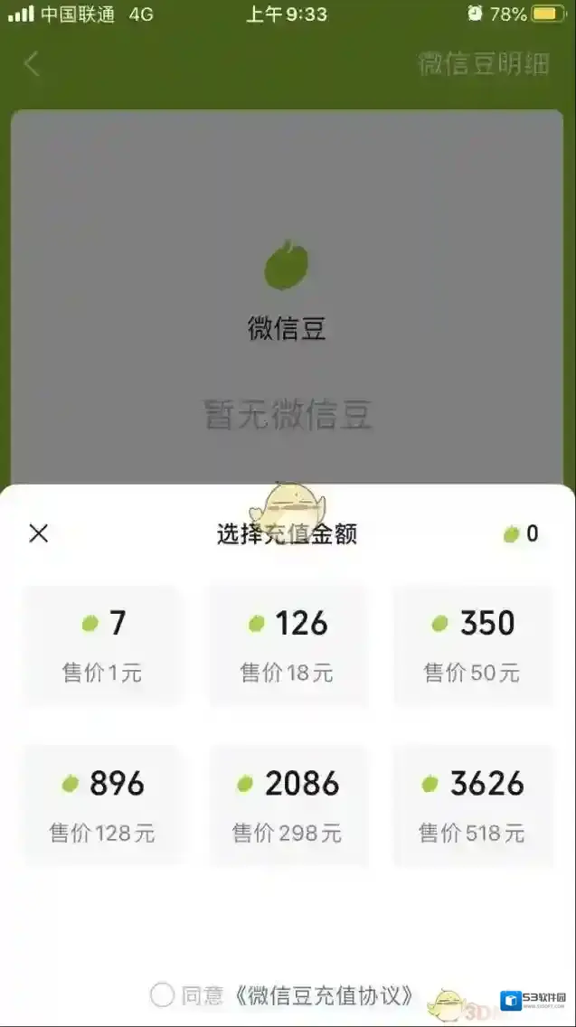 3、然后就进入微信豆界面了,点击下方的“充值”