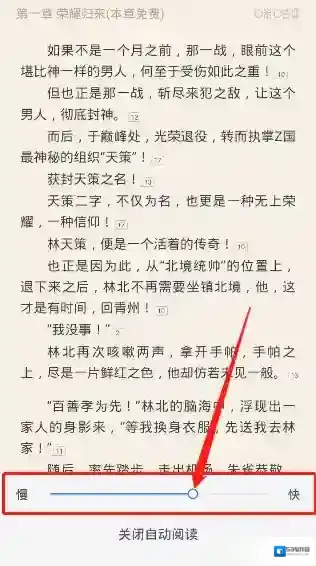 5、在这里我们就就能够看见“慢”“快”的进度条,我们通过控制小球,就能够来调整系统自动阅读的翻页速度。