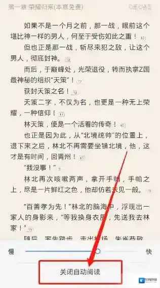 6、如果我们想退出“自动阅读”模式,在最下方就能够看见“关闭自动阅读”这个功能点击即可。