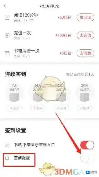 5、拖到最下方我们还能看见“签到提醒”的功能,我们可以把这个功能打开,在每天打开app的时候就不会忘记签到任务了。