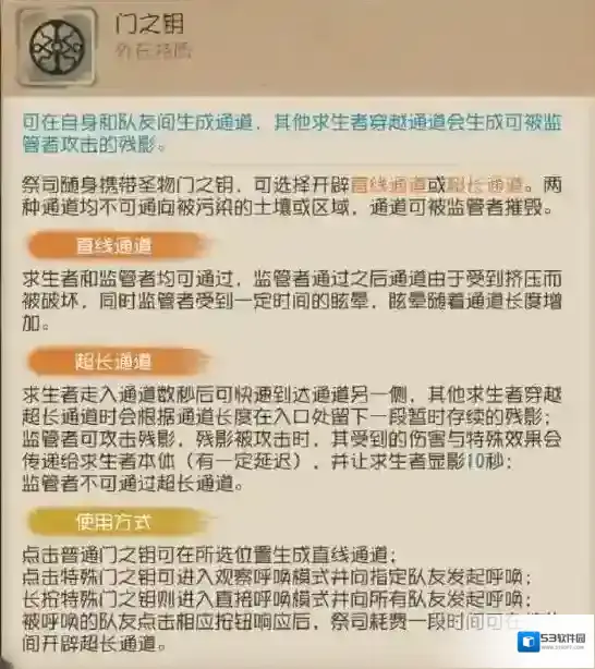 祭司随身携带井盖,可以打开超长通道或者直线通道 直线通道 祭司点击井盖之后,前方会出现一个直线通道,监管者求生者均可以通过,具体方法如下所示。
