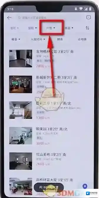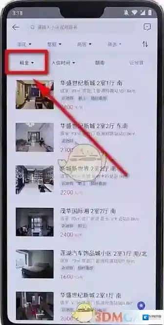 3、点击折叠三角形选择想租的房子的区域,户型,租金