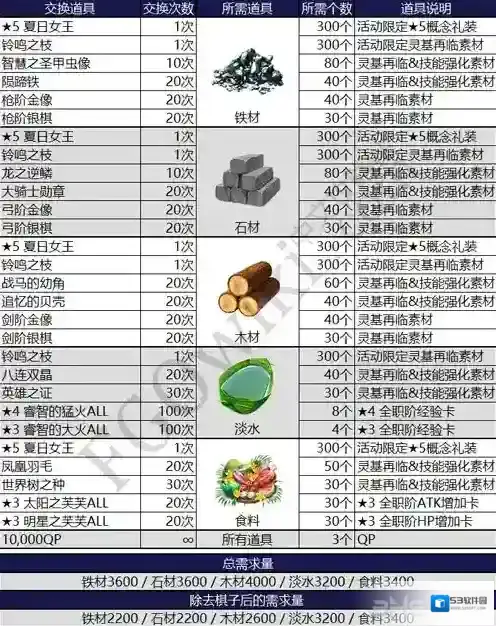 铁材速刷石材速刷木材速刷食料速刷淡水速刷素材获取:FGO泳装一期复刻掉落图