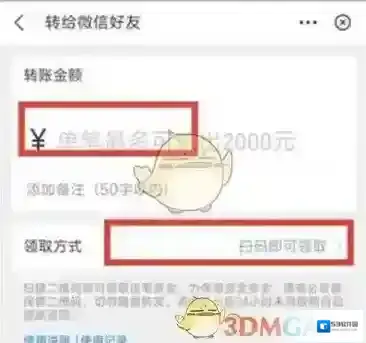2、在转账页面中输入要转入的金额,注意单笔最多转2000;然后在选择领取方式;