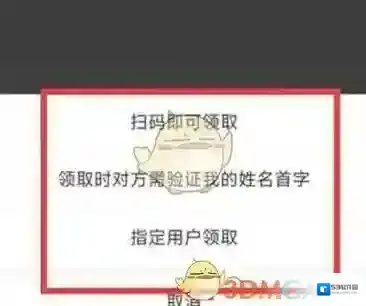3、这里可以选择扫码即可领取、领取时对方需要验证我的名字首字、指定用户领取三种方式;