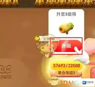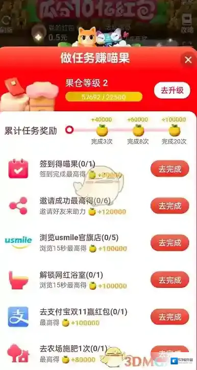 1、如图所示,我们首先需要收集喵果,收集到一定数量可以升级果仓。果仓等级越高,我们能够获得的红包奖励就越多。