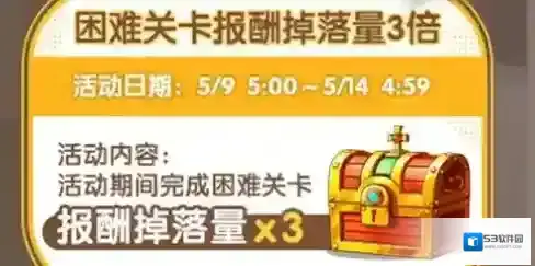 活动内容:活动期间完成困难关卡,报酬掉落量三倍。