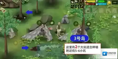 ②收集1号出生地岛上的所有材料以后,吃饱后去右下角的2号主岛建营地,(为什么我让大家去2号岛而不是3号呢,因为2号岛有2个非常接近的鳄鱼刷新点适合安家和很多大小坑位适合种植和捕猎)。