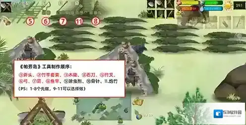 开局制作工具的先后顺序:①斧头、②竹竿套索、③木锄、④石刀、⑤竹叉、⑥弓、⑦箭、⑧鱼竿、⑨除虫剂、⑩骨针、11炮竹。