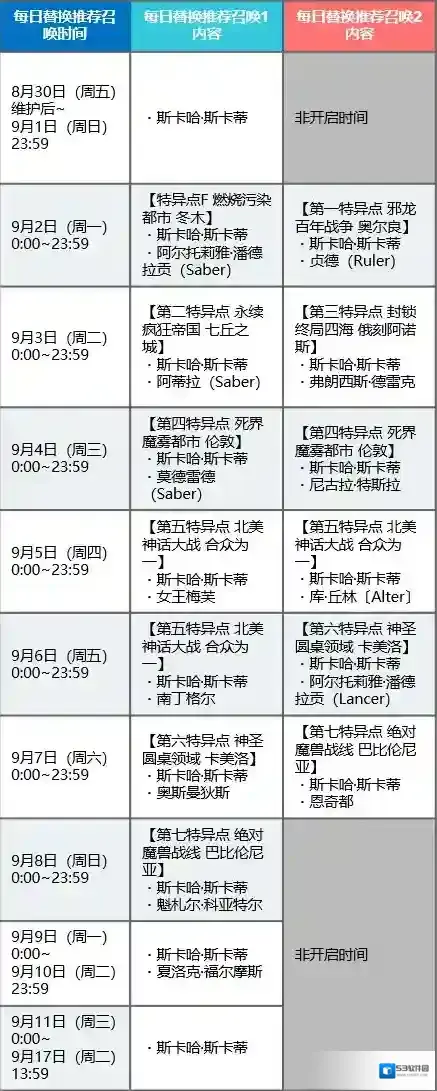 ※「特异点推荐召唤1(每日替换)」和「特异点推荐召唤2(每日替换)」的开启时间不同,敬请注意。