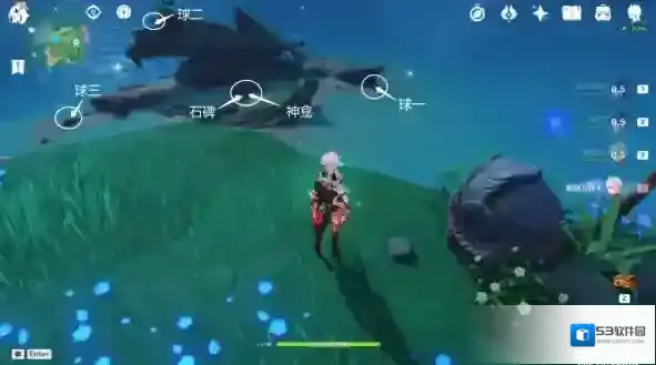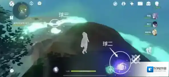 切换火或风属性角色使用元素战技攻击在山坡上的球二,在海滩边的球三