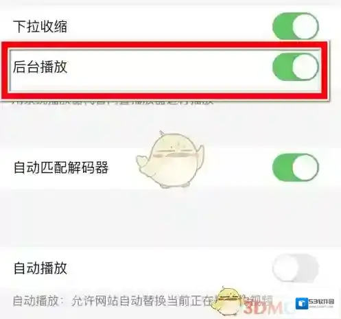 《鲨鱼浏览器》后台播放设置方法 2025-08-09 15:49:19 编辑: 小狮子 分类: 应用教程 • 阅读: 601 1、打开鲨鱼浏览器的首页,选择三横线。 2、选择设置。 3、点击播放器设置选项。 4、点击后台播放选项开关即可。 本文内容来源于互联网,如有侵权请联系删除。 鲨鱼浏览器应用相关内容 全部 鲨鱼浏览器设置 鲨鱼浏览器后台播放 鲨鱼浏览器 鲨鱼浏览器选项 鲨鱼浏览器点击 《鲨鱼浏览器》自动播放关闭方法 1、打开鲨鱼浏览器,点击如图所示的图标,进入新界面; 2、点击并选择设置,就可以进入另外一个界面; 3、点击播放器设置,跳转进入到最新界面; 4、如图所示,点击关闭自动播放即可。 本文内容来源于互联网,如有侵权请联系删除。 2025-08-09 发表回复 请登录后评论... 登录后才能评论 评论列表 ( 0条)