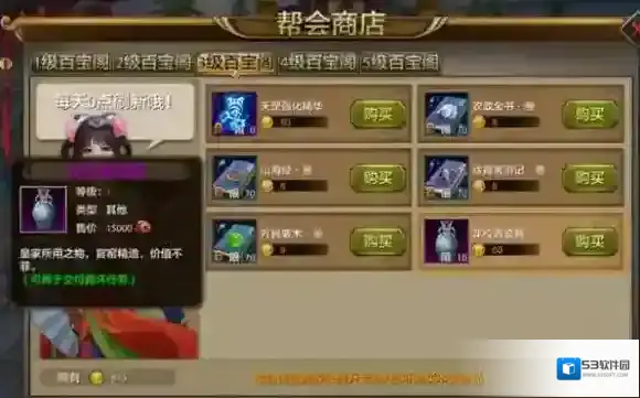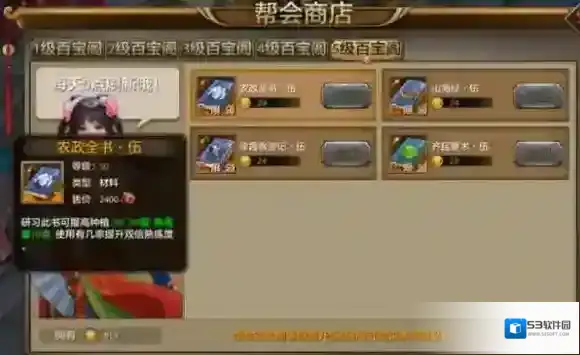 3级帮会商店,可以购买天罡强化精华,采集技能熟练度提升40-59级的书籍,任务道具龙纹青瓷瓶。